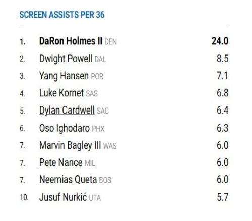 如今根据NBA官网数据显示,杨瀚森本赛季每36分钟的掩护助攻次数,竟然达到7.1次高居联盟第三,仅次于掘金球员霍姆斯和独行侠球员鲍威尔。