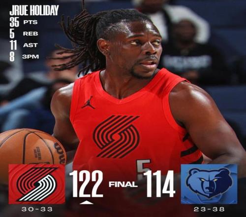 常规赛,开拓者客场122-114战胜灰熊。