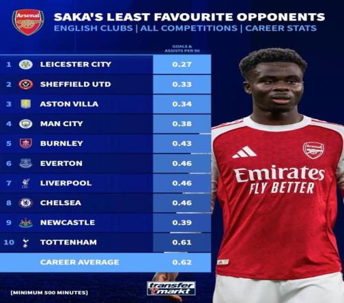 北京时间3月23日,在阿森纳联赛杯决赛0-2不敌曼城之后,德转统计出了萨卡枪手生涯至今各项赛事面对英格兰俱乐部平均每90分钟直接参与进球数最低的10个对手,其中他14次对阵曼城只贡献过2球2助攻,平均每90分钟只能制造0.38球。